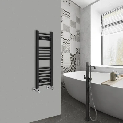 AmazonOur 800x300mm straight heated towel rail black is the perfect solution for your busy family bathroom. Features: 15 Straight bars - 75-95mm Wall to Centre Tapping - 751 BTU heat output - 22mm cross tube diameter. Can be use on all UK heating systems. Comes with adjustable wall brackets and fittings. 10 years 'Fit and Forget' guarantee.