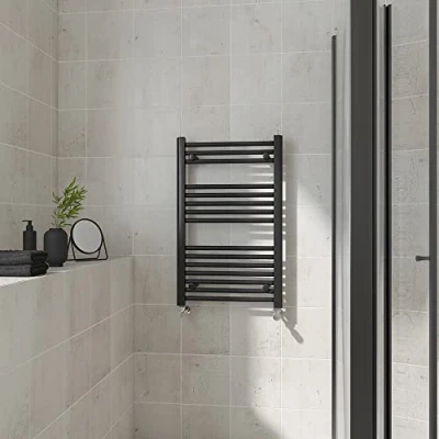 AmazonOur 800x500mm straight heated towel rail black is the perfect solution for your busy family bathroom. Features: 15 Straight bars - 75-95mm Wall to Centre Tapping - 1116 BTU heat output - 22mm cross tube diameter. Can be use on all UK heating systems. Comes with adjustable wall brackets and fittings. 10 years 'Fit and Forget' guarantee.