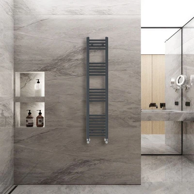 General description The 1400x300mm heated towel radiator in anthracite is a contemporary addition to any bathroom, combining style and functionality. It is designed to fit seamlessly into modern bathroom suites while providing efficient heating for towels and the room itself. Technical specifications Dimensions: 1400x300mm Number of bars: 22 (4+5+5+8) Heat output: 1202 BTU Pressure tested to: 10 bar Maximum working pressure: 7 bar Manufactured to: BS EN 442 Finish: Durable high-quality grey Compatibility and accessories Fixing pack included (complete with plugs and vents) Installation It is recommended to have this towel radiator installed by a qualified plumber to ensure proper setup and functionality. Usage This heated towel rail is perfect for busy family bathrooms, providing a simple yet effective solution for drying towels and warming the space. Other information