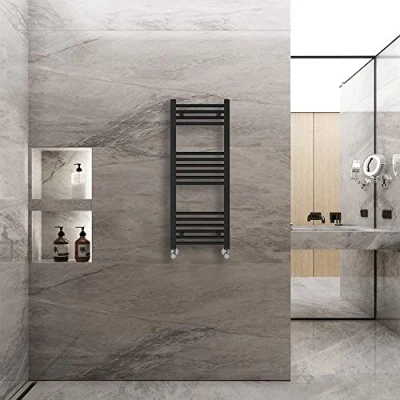AmazonStylish straight rail ladder style towel radiator. Number of bars: 16(4+6+6); Heat output: 1062 BTU Durable high quality black finish. Manufactured to BS EN 442 and 10 year “fit and forget” guarantee Included. Package includes 1x1000x400mm Straight Bathroom Heated Towel Rail Radiator and Fixing Pack and Brackets.