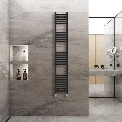 General description The 1800x300mm Black Straight Heated Towel Rail is a contemporary masterpiece, perfectly suited for modern bathrooms. It combines functionality with style, making it ideal for busy family bathrooms. Technical specifications Dimensions: 1800x300mm Number of bars: 30 (6+6+8+10) Heat output: 1590 BTU Durable high-quality black finish Pressure tested to 10 bar Maximum working pressure: 7 bar Manufactured to BS EN 442 Installation It is recommended to have a qualified plumber install this item. Fixing pack included complete with plugs and vents. Other information