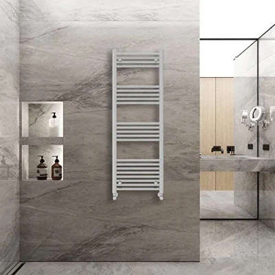 AmazonStylish straight rail ladder style towel radiator; Durable high quality chrome finish. Number of bars: 22(4+5+5+8); Heat output: 1372 BTU; Tube Diameter: 22mm. Anti leak pressure tested to 10 bars, exceed 200 hours of neutral acid salt spray testing. Manufactured to BS EN 442 and 10 year 'fit and forget' guarantee Included. Package includes 1x1400x500mm Straight Bathroom Heated Towel Rail Radiator and Fixing Pack and Brackets.