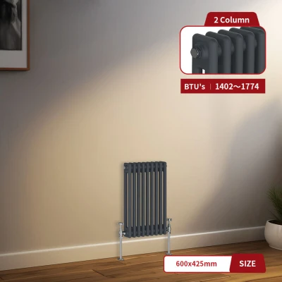 General description Experience the perfect blend of tradition and style with the Warmehaus Traditional Radiator. This Victorian-style column radiator, available in a double column layout, is ideal for those looking to make a contemporary statement while honoring classic design elements. With its timeless appeal, this designer radiator enhances your interior aesthetics while providing high heat outputs, ensuring that your spaces remain warm and inviting without sacrificing style. Crafted from high-quality steel, it comes with a 10-year Fit and Forget Guarantee. Technical specifications Material: 1.5mm low carbon steel construction Size: 600 x 425mm Panel: Double Column Finish: Anthracite Number of bars: 9 Pipe Center: 495mm High Heat Output: 1403-1775 BTU (in T50 - T60) Model: Horizontal Double Panel in Anthracite Finish Accreditation: Tested to BS EN442 Triple layered finish to exceed 200 hours of neutral acid salt spray testing Installation Each unit is supplied complete with all