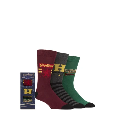 Anytime is time to relive the magic of Hogwarts School of Witchcraft and Wizardry with this set of SOCKSHOP Harry Potter Gift Boxed Cotton Socks! This good-looking gift package includes three pairs of quality men’s socks with unique Gryffindor, Hogwarts and Triwizard Tournament designs that fans will want to own and wear whenever they can! Each of the three styles of Harry Potter socks in the set is very fun, individual and colourfully made, knitted using quality cotton rich blends of fibres that give them bright colours, a soft feel, durability and a great fit! The socks are all crew length and with designs that are towards the tops of the legs, leaving the ankles and feet plain — so you can wear them with long trousers and in nearly any situation — and like magic, no-one will know!