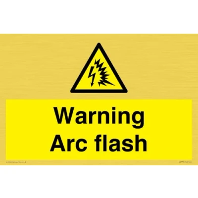 W042 : Arc flash This sign is made from vinyl gold sticker Gold metal effect sticker for flat, clean surfaces. Not for rough, plastic, or dusty surfaces. A4 landscape Sign Text: Warning Arc flash