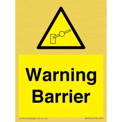 W902 : Barrier This sign is made from vinyl gold sticker Gold metal effect sticker for flat, clean surfaces. Not for rough, plastic, or dusty surfaces. A7 portrait Sign Text: Warning Barrier