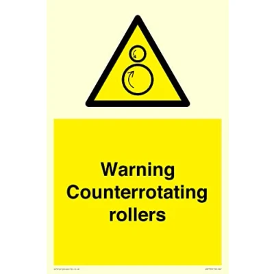 W025 : Counterrotating rollers This sign is made from vinyl photoluminescent sticker A4 portrait Sign Text: Warning Counterrotating rollers