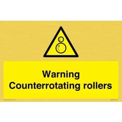 W025 : Counterrotating rollers This sign is made from vinyl gold sticker Gold metal effect sticker for flat, clean surfaces. Not for rough, plastic, or dusty surfaces. A4 landscape Sign Text: Warning Counterrotating rollers