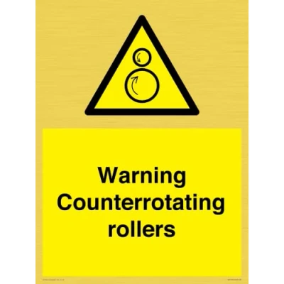 W025 : Counterrotating rollers This sign is made from vinyl gold sticker Gold metal effect sticker for flat, clean surfaces. Not for rough, plastic, or dusty surfaces. A3 portrait Sign Text: Warning Counterrotating rollers