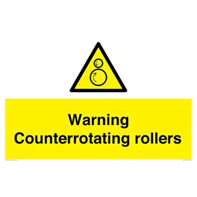 W025 : Counterrotating rollers This sign is made from vinyl / sticker Air Release vinyl makes it easy to stick to flat, clean surfaces without bubbles. Not for rough, plastic or dusty surfaces. A2 landscape Sign Text: Warning Counterrotating rollers