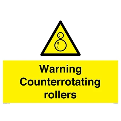 W025 : Counterrotating rollers This sign is made from vinyl / sticker Air Release vinyl makes it easy to stick to flat, clean surfaces without bubbles. Not for rough, plastic or dusty surfaces. A1 landscape Sign Text: Warning Counterrotating rollers