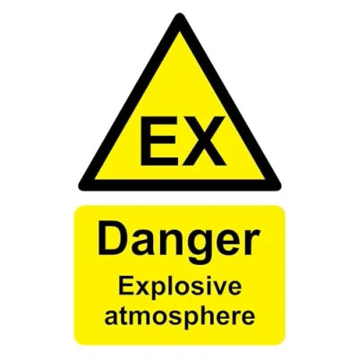Warning Danger explosive atmosphere safety sign Self adhesive sticker 200mm x 150mm Remove backing film and apply to dry, smooth, oil free surface. Digitally printed and laminated for extra durabillity