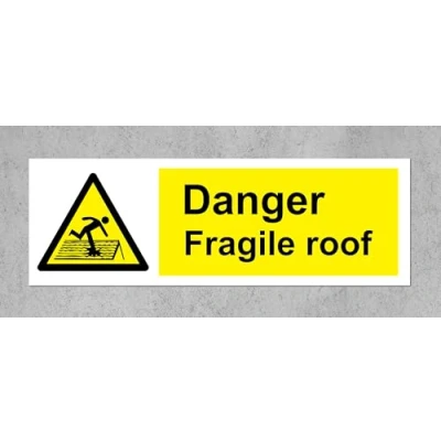 Warning Danger fragile roof safety sign Self adhesive sticker 200mm x 66mm Digitally printed and laminated for extra durability Drill and screw in position or use double sided tape to mount onto suitable surface.