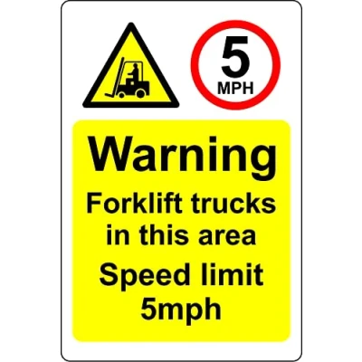 Warning forklift trucks in this area Speed limit 5 mph Safety sign 1mm Plastic sign Digitally printed for extra durability Drill and screw in position or use double sided tape to mount onto suitable surface.