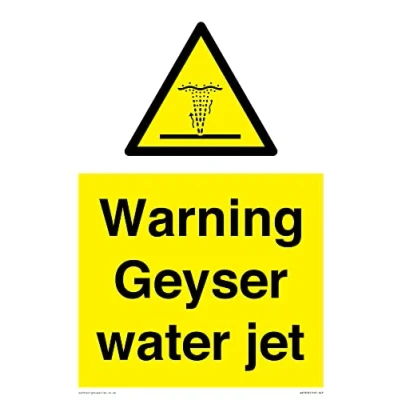W515 : Geyser (water/air) water jet This sign is made from vinyl / sticker Air Release vinyl makes it easy to stick to flat, clean surfaces without bubbles. Not for rough, plastic or dusty surfaces. A4 portrait Sign Text: Warning Geyser water jet