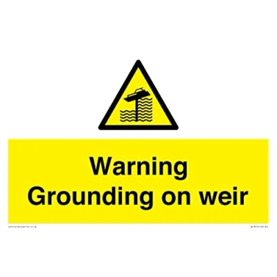 W521 : Grounding on weir This sign is made from vinyl / sticker Air Release vinyl makes it easy to stick to flat, clean surfaces without bubbles. Not for rough, plastic or dusty surfaces. A4 landscape Sign Text: Warning Grounding on weir