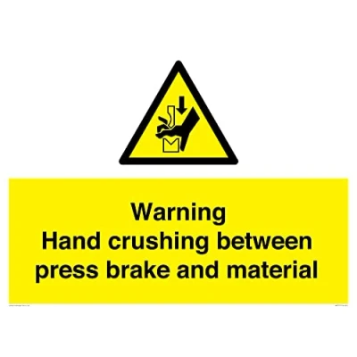 W030 : Hand crushing between press brake tool This sign is made from vinyl high tack A stickier sticker. Uses a stronger adhesive to make it more suitable for plastic surfaces like Wheelie Bins or where the sticker might get rubbed. A1 landscape Sign Text: Warning Hand crushing between press brake and material