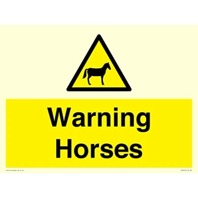 W506 : Horses This sign is made from vinyl photoluminescent sticker A3 landscape Sign Text: Warning Horses