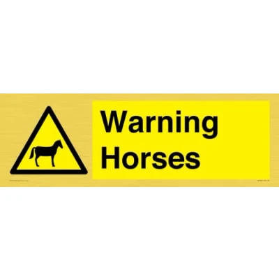 W506 : Horses This sign is made from vinyl gold sticker Gold metal effect sticker for flat, clean surfaces. Not for rough, plastic, or dusty surfaces. 62 landscape Sign Text: Warning Horses