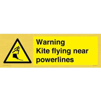 W505 : Kite flying near overhead power lines This sign is made from vinyl gold sticker Gold metal effect sticker for flat, clean surfaces. Not for rough, plastic, or dusty surfaces. 41 landscape Sign Text: Warning Kite flying near powerlines