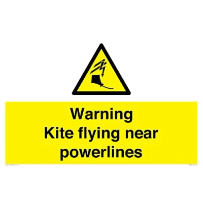W505 : Kite flying near overhead power lines This sign is made from vinyl / sticker Air Release vinyl makes it easy to stick to flat, clean surfaces without bubbles. Not for rough, plastic or dusty surfaces. A2 landscape Sign Text: Warning Kite flying near powerlines