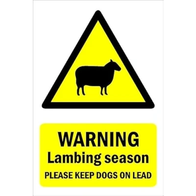Warning lambing season please keep dogs on lead. 1mm flexible Plastic sign. Digitally printed for extra durability. Drill and screw in position or use double sided tape to mount onto suitable surface. All signs come with a 5-year warranty. All our signs are UV resistant meaning they will not fade in sunlight. Suitable for indoor & outdoor use.