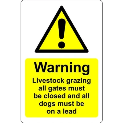 Warning livestock grazing all gates must be locked and dogs on a lead Farm Safety sign 1.2mm Rigid plastic 300mm x 200mm