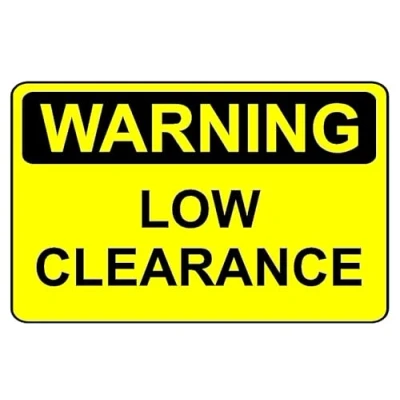 Warning low clearance safety sign. 1mm flexible Plastic sign. Digitally printed for extra durability. Drill and screw in position or use double sided tape to mount onto suitable surface. All signs come with a 5-year warranty. All our signs are UV resistant meaning they will not fade in sunlight. Suitable for indoor & outdoor use.