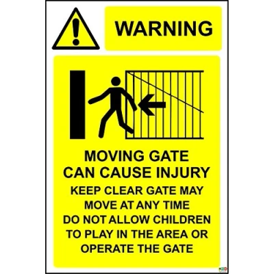 Warning Moving gates can cause injury sign Self adhesive vinyl 300mm x 200mm Digitally printed and laminated for extra durability Remove backing film and apply to dry, smooth, oil free surface.