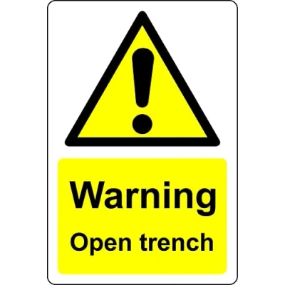 Warning open trench Safety sign 1mm Plastic sign Digitally printed for extra durability Drill and screw in position or use double sided tape to mount onto suitable surface.