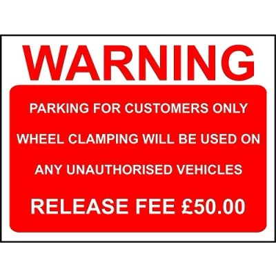 Warning Parking For Customers Only Wheel Clamping Release Fee £50.00 safety sign 3mm Aluminium 300mm x 200mm