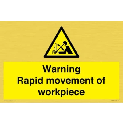 W032 : Rapid movement of workpiece in press brake This sign is made from vinyl gold sticker Gold metal effect sticker for flat, clean surfaces. Not for rough, plastic, or dusty surfaces. A4 landscape Sign Text: Warning Rapid movement of workpiece