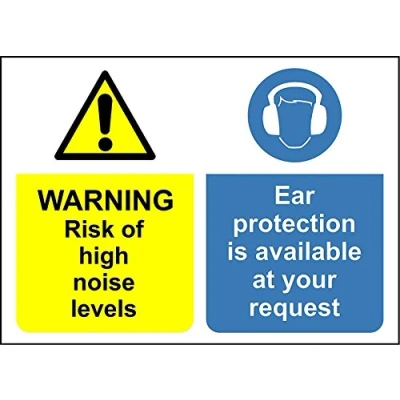 Warning risk of high noise levels ear protection must be worn safety sign 3mm Aluminium sign 300mm x 200mm Digitally printed and laminated for extra durability 10mm Radius rounded corners, no sharp edges