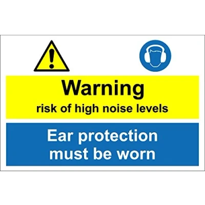Warning risk of high noise levels. Ear protection must be worn sign 1.2mm rigid plastic 400mm x 300mm Digitally printed and laminated for extra durability Drill and screw in position or use double sided tape to mount onto suitable surface.