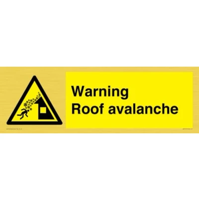 W040 : Roof avalanche This sign is made from vinyl gold sticker Gold metal effect sticker for flat, clean surfaces. Not for rough, plastic, or dusty surfaces. 41 landscape Sign Text: Warning Roof avalanche