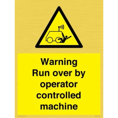 W037 : Run over by remote operator controlled machine This sign is made from vinyl gold sticker Gold metal effect sticker for flat, clean surfaces. Not for rough, plastic, or dusty surfaces. A3 portrait Sign Text: Warning run over by operator controlled machine