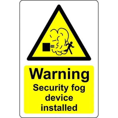 Warning security fog device installed Safety sign 1mm Plastic sign Digitally printed for extra durability Drill and screw in position or use double sided tape to mount onto suitable surface.
