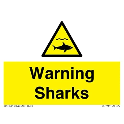 W054 : Sharks This sign is made from vinyl / sticker Air Release vinyl makes it easy to stick to flat, clean surfaces without bubbles. Not for rough, plastic or dusty surfaces. A7 landscape Sign Text: Warning sharks