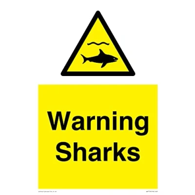 W054 : Sharks This sign is made from vinyl / sticker Air Release vinyl makes it easy to stick to flat, clean surfaces without bubbles. Not for rough, plastic or dusty surfaces. A4 portrait Sign Text: Warning sharks