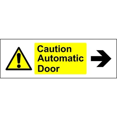 Warning signs Caution automatic door arrow right Safety sign Self adhesive sticker 150mm x 50mm Remove backing film and apply to dry, smooth, oil free surface. Digitally printed and laminated for extra durability, Manufacturer: KPCM Display