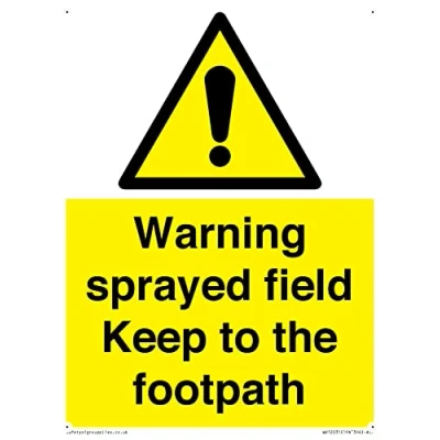 W001 : General Warning This sign is made from plastic semi-rigid 1mm Comes with3mm Corner Holes. 1mm thin plastic sign, can be screwed, stuck with adhesive, or attached with cable ties. Not suitable for hanging. A5 portrait Sign Text: Warning sprayed field Keep to the footpath