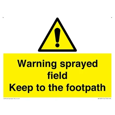 W001 : General Warning This sign is made from plastic semi-rigid 1mm Comes with3mm holes on top corners. 1mm thin plastic sign, can be screwed, stuck with adhesive, or attached with cable ties. Not suitable for hanging. A5 landscape Sign Text: Warning sprayed field Keep to the footpath