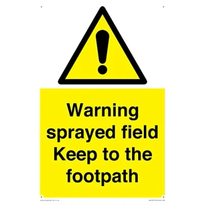W001 : General Warning This sign is made from plastic semi-rigid 1mm Comes with4mm Corner Holes. 1mm thin plastic sign, can be screwed, stuck with adhesive, or attached with cable ties. Not suitable for hanging. A4 portrait Sign Text: Warning sprayed field Keep to the footpath