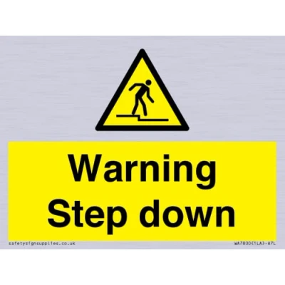 W070 : Step down This sign is made from vinyl silver sticker A7 landscape Sign Text: Warning Step down