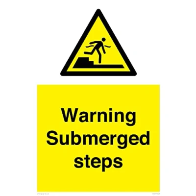 W512 : Submerged step or steps This sign is made from vinyl / sticker Air Release vinyl makes it easy to stick to flat, clean surfaces without bubbles. Not for rough, plastic or dusty surfaces. A2 portrait Sign Text: Warning Submerged steps