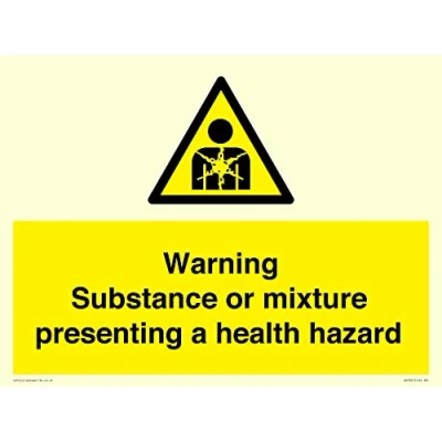 W071 : Substance or mixture presenting a health hazard This sign is made from vinyl photoluminescent sticker A3 landscape Sign Text: Warning Substance or mixture presenting a health hazard