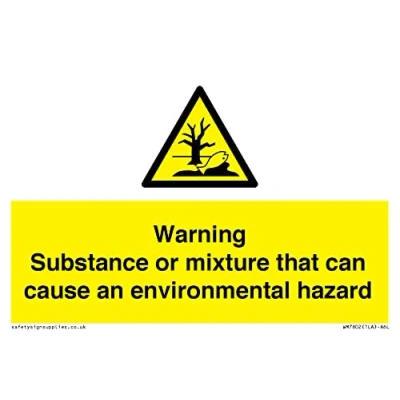 W072: Substance or mixture which may cause an environmental hazard This sign is made of vinyl/sticker Air release vinyl makes it easy to stick to flat, clean surfaces with no bubbles. Not for rough, plastic or dusty surfaces. A6 landscape Sign text: Warning substance or mixture which may cause an environmental hazard