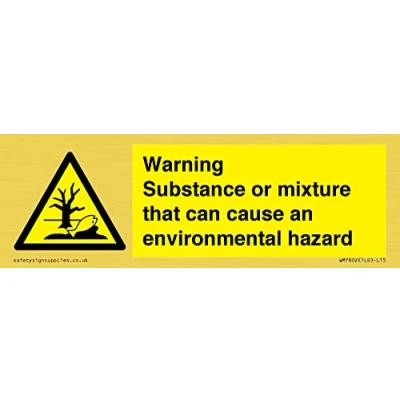 W072: Substance or mixture which may cause an environmental hazard This sign consists of a gold colored vinyl decal Gold metal effect decal for flat clean surfaces. Not for rough, plastic or dusty surfaces. 15 Landscape Label text: Warning substance or mixture which may cause an environmental hazard