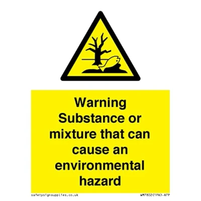 W072 : Substance or mixture that can cause an environmental hazard This sign is made from vinyl / sticker Air Release vinyl makes it easy to stick to flat, clean surfaces without bubbles. Not for rough, plastic or dusty surfaces. A7 portrait Sign Text: Warning Substance or mixture that can cause an environmental hazard