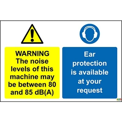 Warning The Noise Levels of This Machine May be Between 80 and 85 dB(A) Ear Protection is Available at Your Request Safety Sign Self Adhesive Sticker 150mm x 200mm